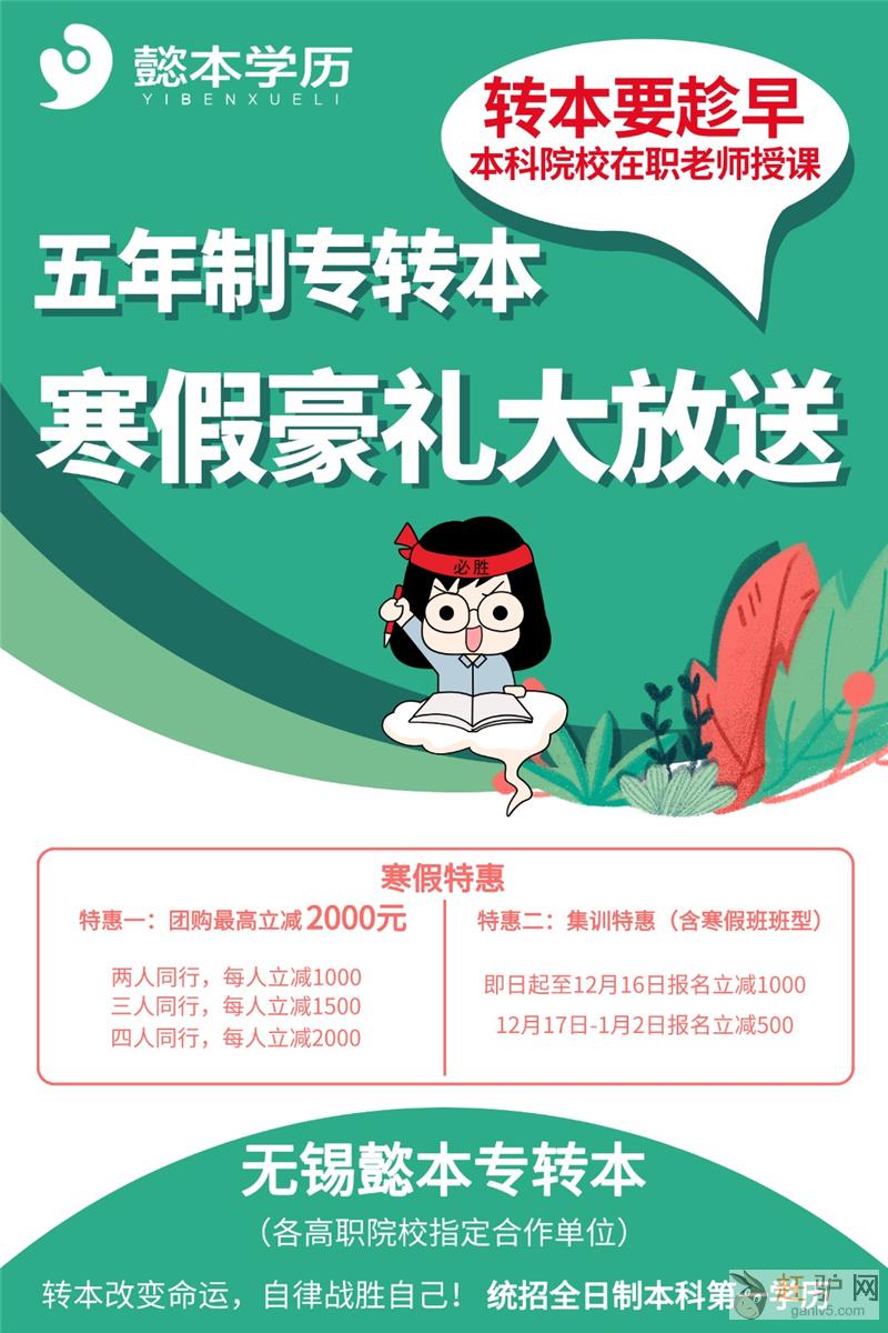 相比较之下,专转本的含金量是最高的。在分层的中国社会结构中,高学历易受到尊重,有了它,你就有机会进入高层次的人才俱乐部赶驴网。当今社会学历不仅仅是找工作时的敲门砖,更是被大家衡量人生价值的标准。无锡懿本学历专注于五年一贯制专转本,小班化教学,寒暑假集训,优秀师资力量,强大的后勤保障。我们开设南京晓庄学院、金陵科技学院、淮阴工学院、苏州大学文正学院、苏州大学应用技术学院、三江学院、南京医科大学康达学院、盐城工学院、南京师范大学中北学院、南通大学、江苏第二师范学院五年制专转本本科直通班g+a+n+l+v+5+c+o+m。五年制专转本培训辅导开设周末班、暑假班、寒假班实行循环滚动开班制,随到随学。想了解更多可咨询赵老师,电话13812089757(微信同号)QQ:2835954150,免费预约试听课。